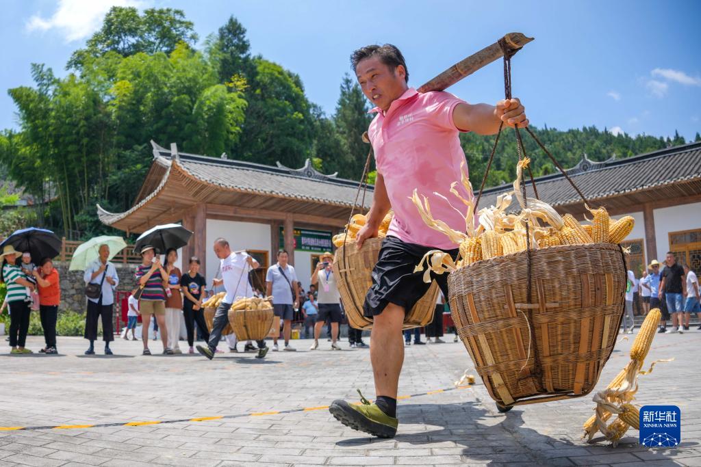 8月12日,村民在宣恩縣椒園鎮黃坪村的景區趣味運動(dòng)會(huì )上參加挑玉米比賽。