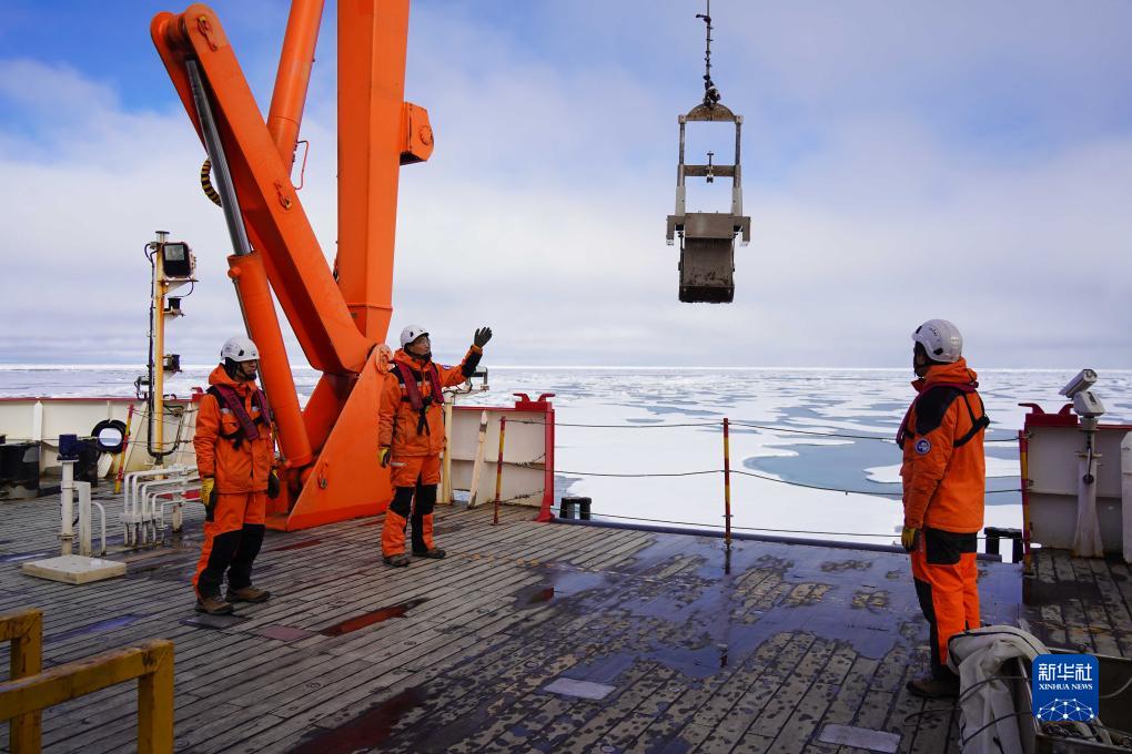 8月6日,在“雪龍2”號極地科考破冰船尾甲板,科考隊員在進(jìn)行箱式沉積物采樣作業(yè)。