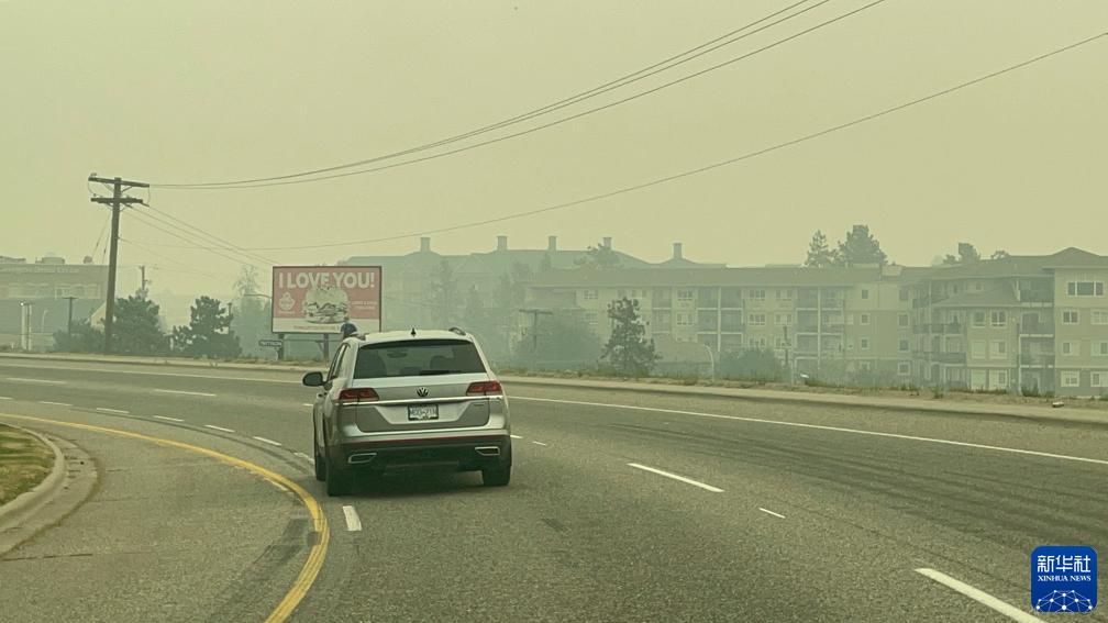 8月20日,在加拿大基洛納,車(chē)輛在野火煙霾籠罩中的道路上行駛。