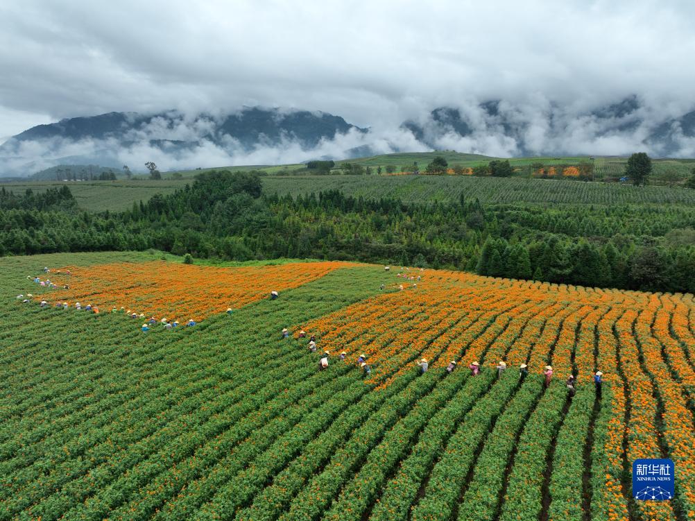 8月22日,在云南省騰沖市明光鎮鳳凰社區,農民在采收萬(wàn)壽菊(無(wú)人機照片)。