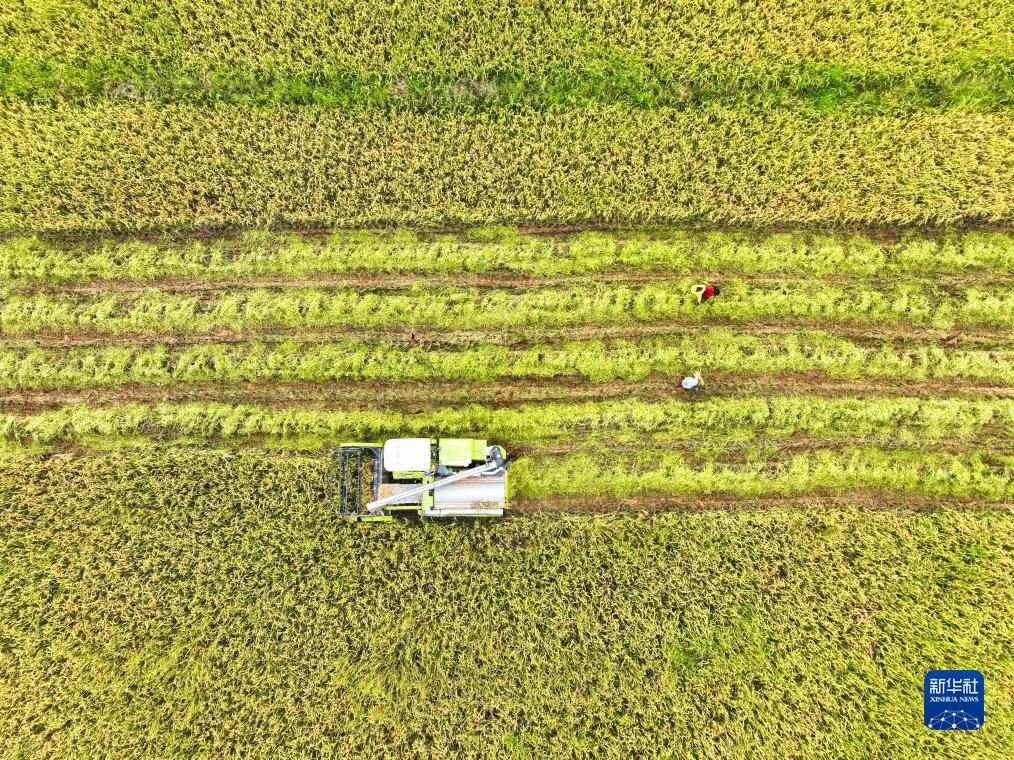 8月20日,湖南省常寧市板橋鎮西洞村農民駕駛農機在收獲水稻(無(wú)人機照片)。