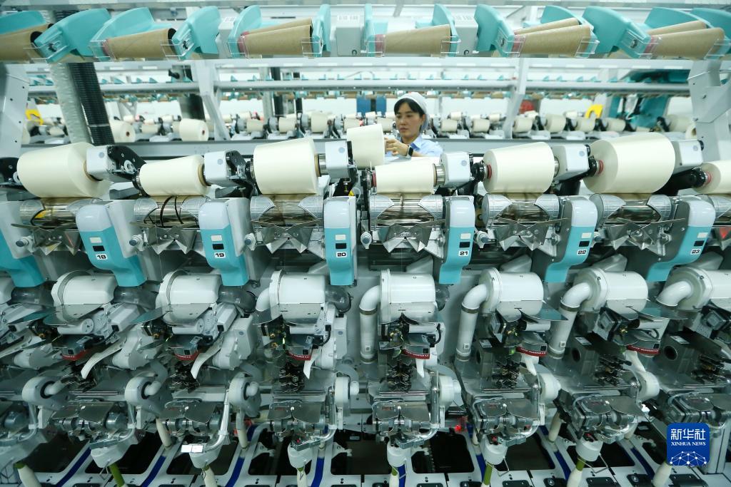 8月22日,青島即發(fā)盛寶紡織有限公司工人在數字化紡紗智能生產(chǎn)線(xiàn)上生產(chǎn)高端纖維。