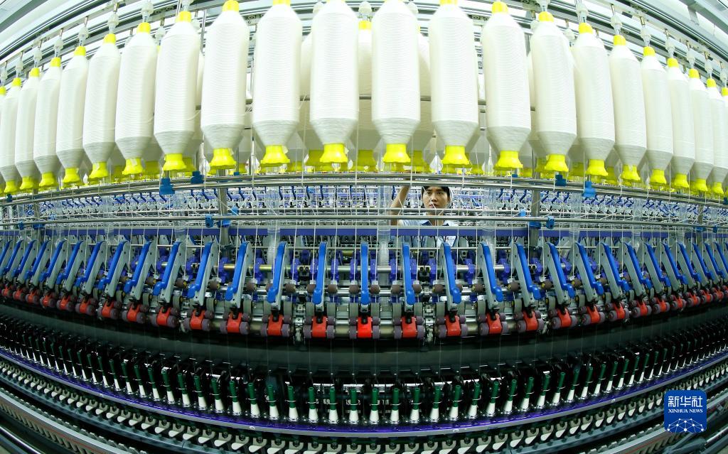 8月22日,青島即發(fā)盛寶紡織有限公司工人在數字化紡紗智能生產(chǎn)線(xiàn)上生產(chǎn)高端纖維。