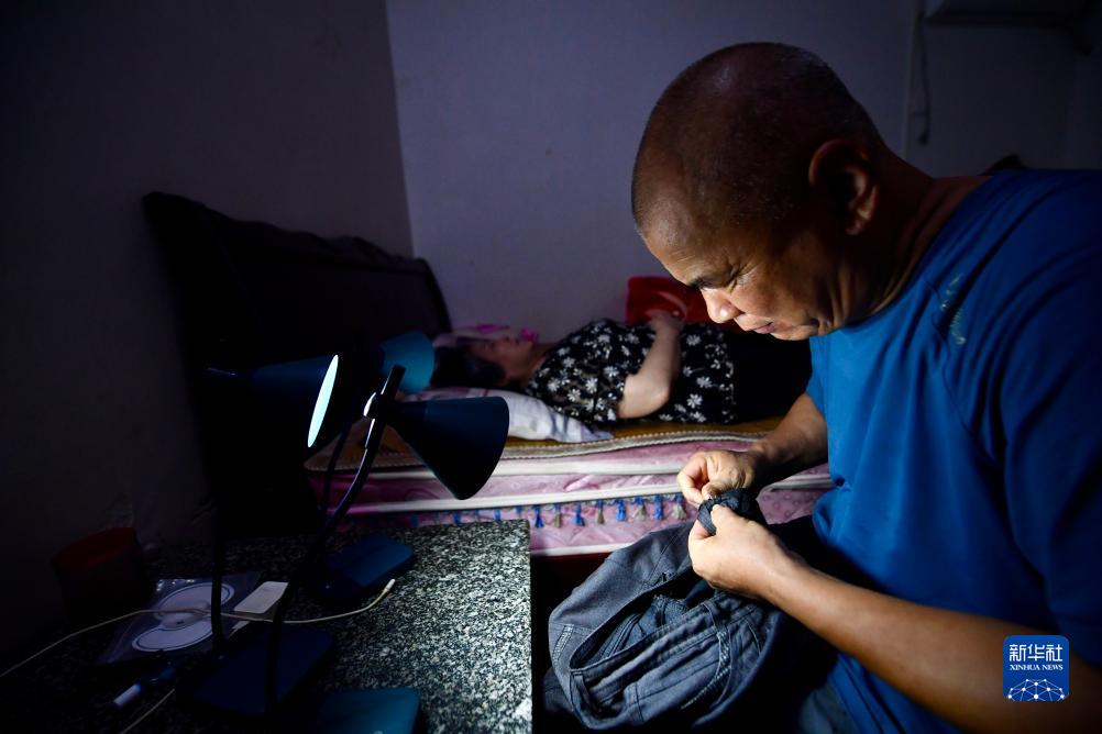 8月17日晚,鄭其輝在妻子休息后縫補衣物。