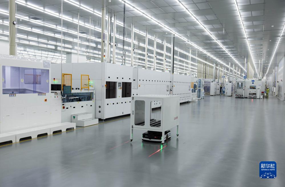 8月22日,在四川省丹棱縣經(jīng)濟開(kāi)發(fā)區的眉山璉升光伏8GW高效異質(zhì)結電池項目電池車(chē)間,智能機器人搬運物料。