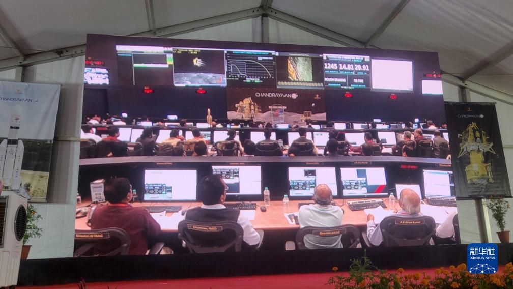 8月23日,在印度班加羅爾,一處大屏幕播放印度月球探測器相關(guān)直播畫(huà)面。