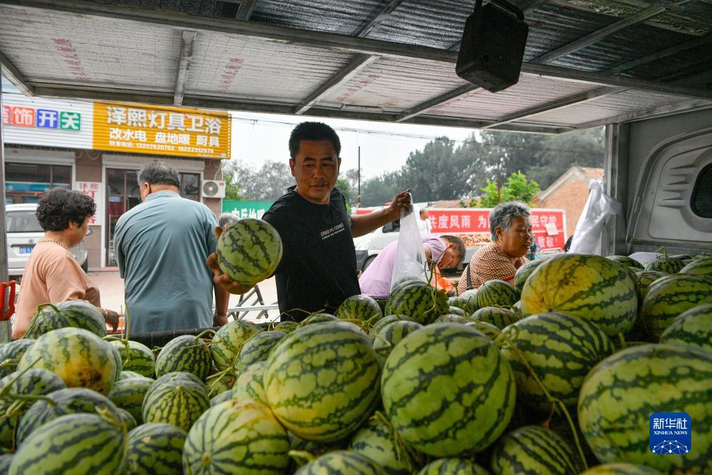 8月25日,在天津市靜海區臺頭鎮,商戶(hù)為前來(lái)趕集的村民挑選臺頭西瓜。