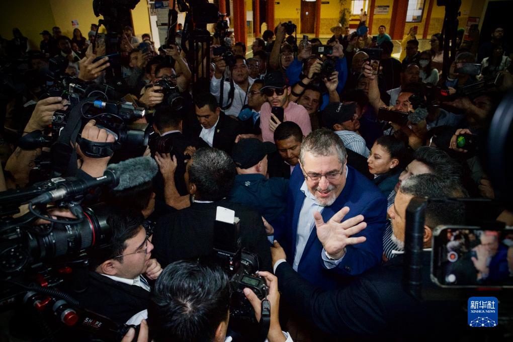 8月20日,在危地馬拉首都危地馬拉城一處投票站,?!胺N子運動(dòng)”黨候選人貝爾納多·阿雷瓦洛在投票后揮手示意。