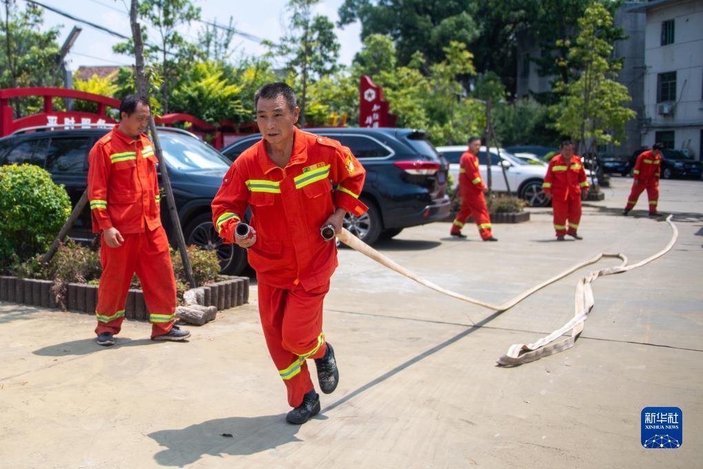 8月25日,在瀏陽(yáng)市金剛鎮政府院內,黃蔚谷(左二)和同事們進(jìn)行消防演練。