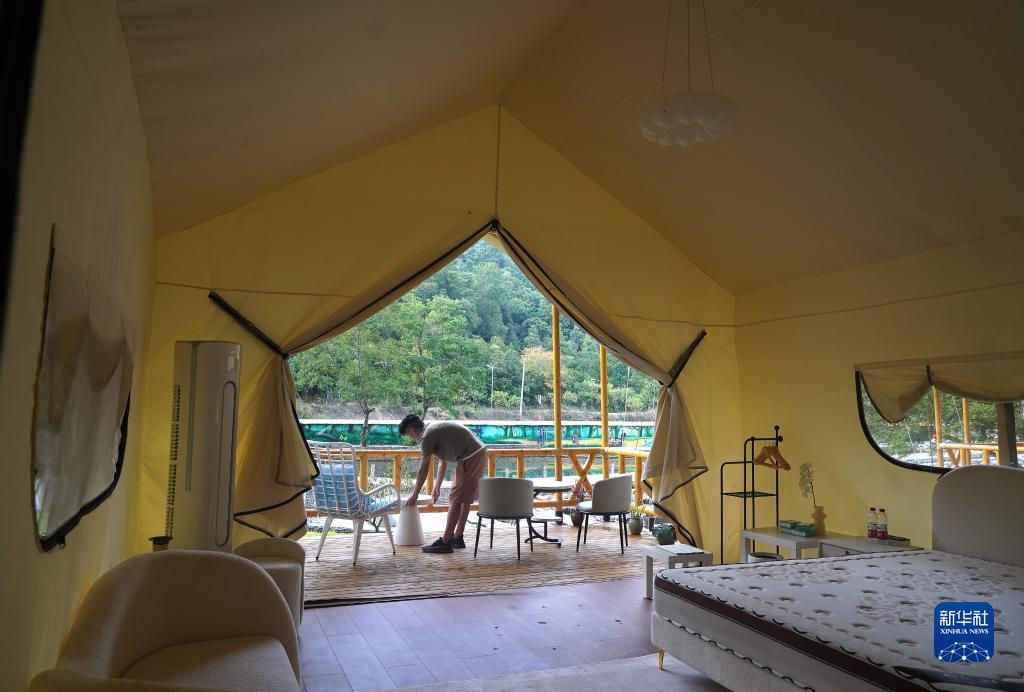 包希孟在打掃一間戶(hù)外帳篷,港背村瑪瑙巖森林小鎮的戶(hù)外帳篷營(yíng)地不久后將對外開(kāi)放(8月24日攝)。