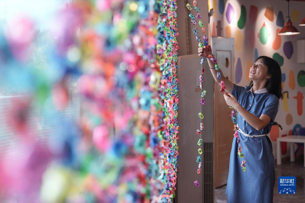 8月27日,在重慶市北碚區縉云幼兒園美術(shù)室,教師在整理玩具掛件。