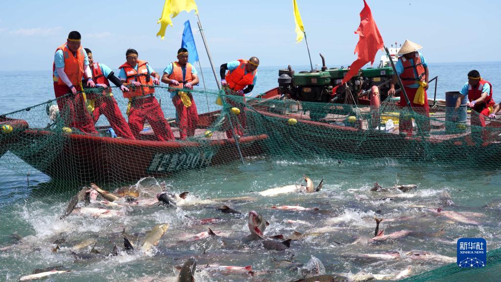 漁民在新疆博斯騰湖拉網(wǎng)捕魚(yú)(6月23日攝)。當日,新疆博斯騰湖第十六屆開(kāi)湖季捕魚(yú)節開(kāi)幕。經(jīng)過(guò)三個(gè)多月的禁漁期,漁民捕獲開(kāi)湖后的第一網(wǎng)魚(yú)。