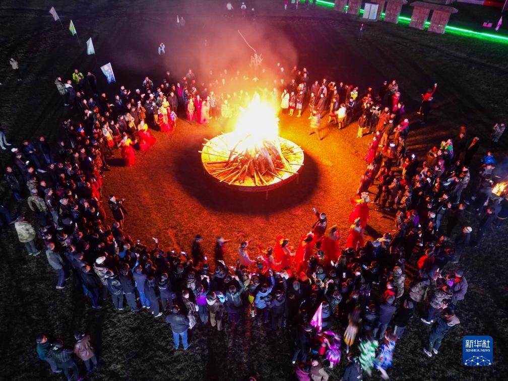 新疆和田策勒縣板蘭格景區,游客在環(huán)塔拉力賽昆侖天路賽段篝火晚會(huì )上載歌載舞(5月30日攝,無(wú)人機照片)。