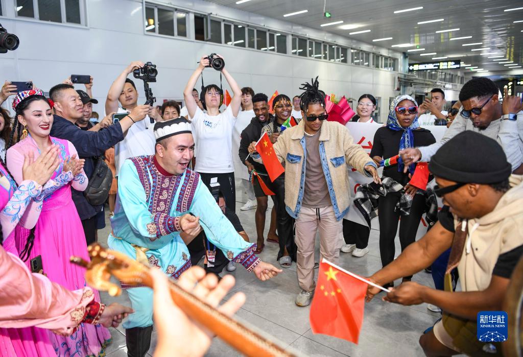 第六屆中國新疆國際民族舞蹈節在烏魯木齊舉行,新疆藝術(shù)劇院木卡姆藝術(shù)團的演員在烏魯木齊地窩堡國際機場(chǎng)盛情起舞,歡迎抵達的南非舞蹈演員(7月24日攝)。