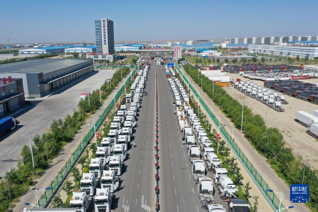 國產(chǎn)商品車(chē)排隊進(jìn)入新疆霍爾果斯綜合保稅區(7月26日攝,無(wú)人機照片)。