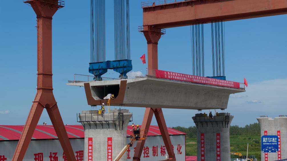 8月31日,工人在吊裝滬渝蓉高鐵滬寧段首榀箱梁(無(wú)人機照片)。