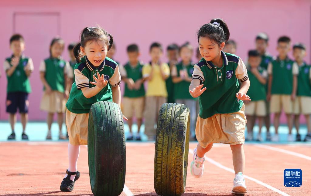 9月1日,在山東省滕州市西崗鎮中心幼兒園,孩子們在玩滾輪胎游戲。