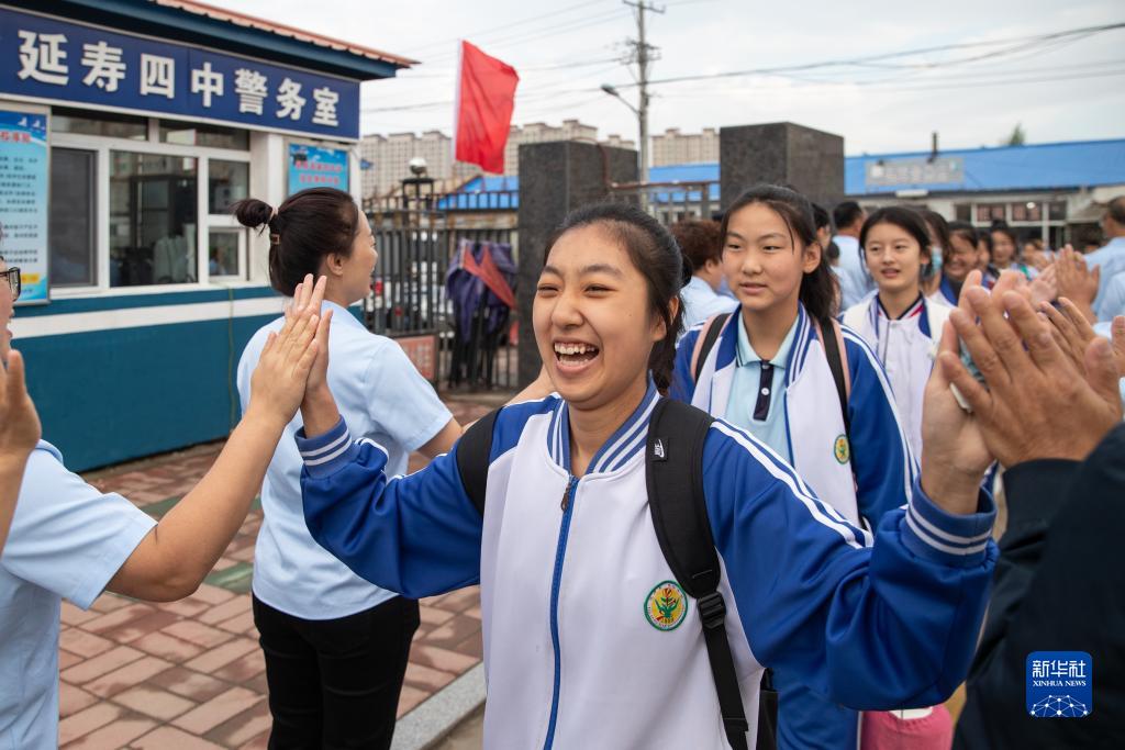 9月1日,在哈爾濱市延壽縣第四中學(xué),學(xué)生與教師擊掌。