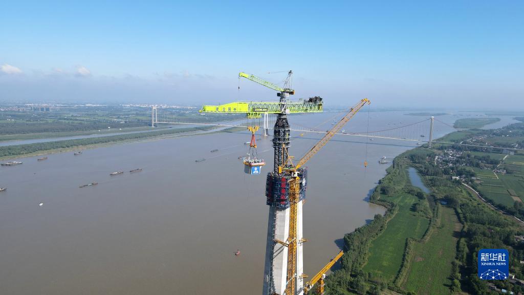 這是9月1日拍攝的中交二航局巢馬城際鐵路馬鞍山公鐵兩用長(cháng)江大橋南主塔首節段鋼塔吊裝現場(chǎng)(無(wú)人機照片)。