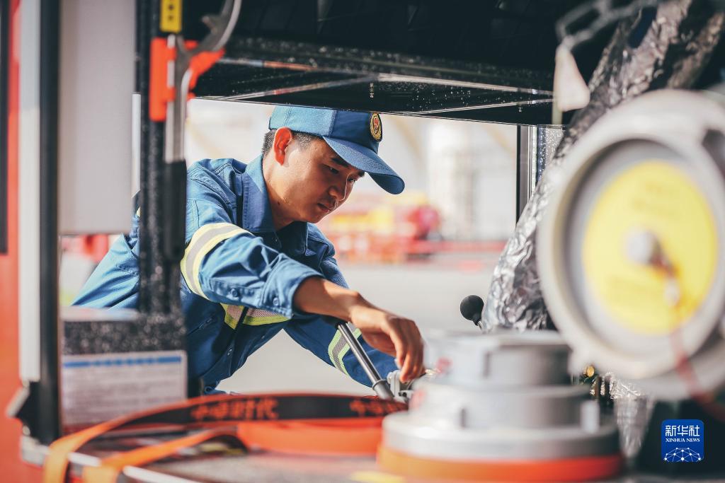 專(zhuān)業(yè)技術(shù)保障分隊隊員展示檢修消防車(chē)水閥(8月31日攝)。
