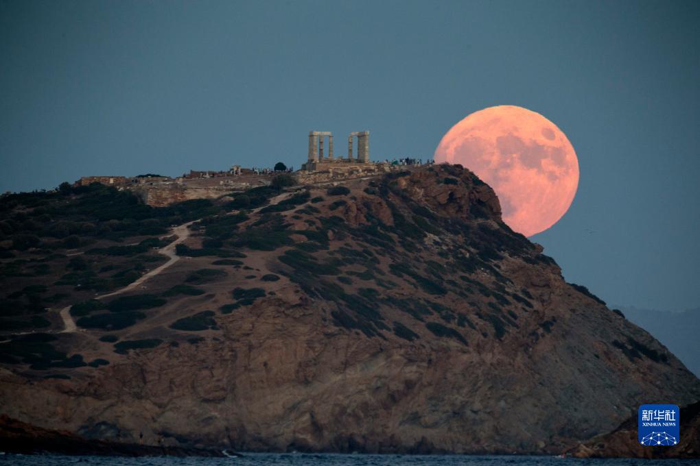 8月30日,“超級月亮”從希臘蘇尼翁角的波塞冬廟上空升起。
