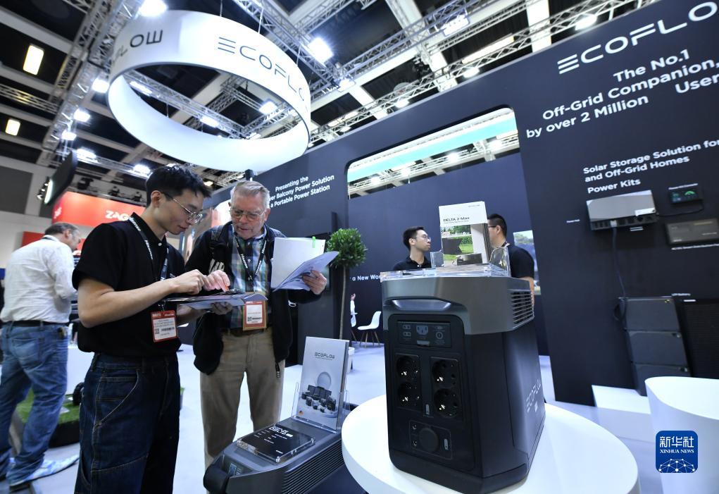 9月1日,在德國柏林國際消費電子展正浩創(chuàng )新展區,參展商(左)向參觀(guān)者介紹一款移動(dòng)儲能設備。