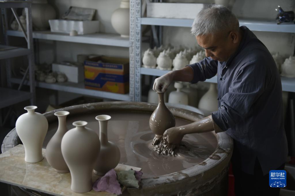 8月31日,在清涼寺村的一家汝瓷生產(chǎn)企業(yè),汝瓷藝人王占穩在車(chē)間里施釉。