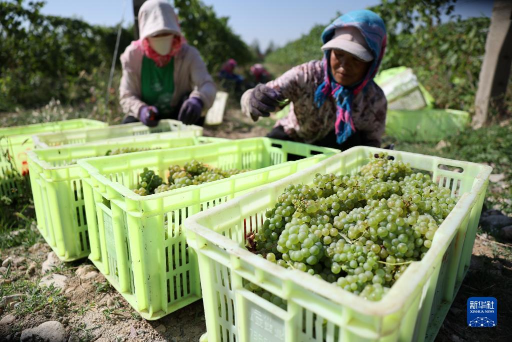 采摘工在銀川市西夏區志輝源石酒莊分揀釀酒葡萄(9月1日攝)。