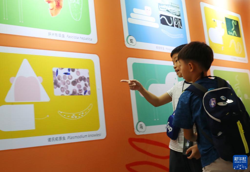 9月2日,小朋友在一個(gè)寄生蟲(chóng)知識展板前參觀(guān)。