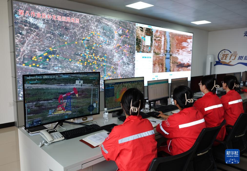 9月1日,工作人員在大慶石化公司第三采油廠(chǎng)第八作業(yè)區的生產(chǎn)指揮中心監測生產(chǎn)設備運行情況。指揮中心利用雷達、無(wú)人機等數字化手段,對油水井等設備設施進(jìn)行巡檢,相較于傳統模式,其巡檢范圍更廣、效率和精準度更高。
