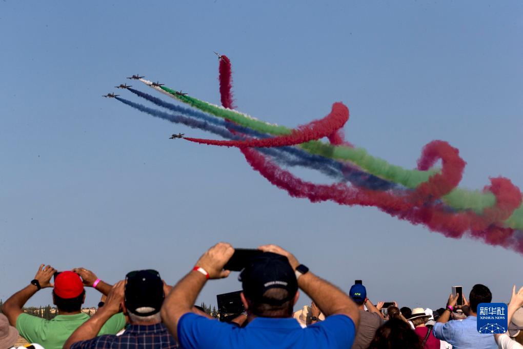 9月2日,觀(guān)眾在希臘塔納格拉空軍基地舉行的雅典飛行周上拍攝阿聯(lián)酋飛行表演隊的表演。