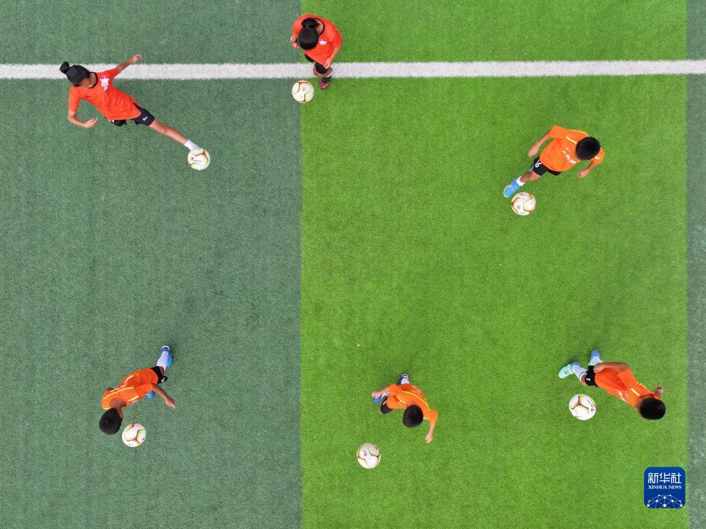 9月4日,在長(cháng)沙市南雅望城學(xué)校,學(xué)生在開(kāi)學(xué)典禮上表演足球顛球(無(wú)人機照片)。