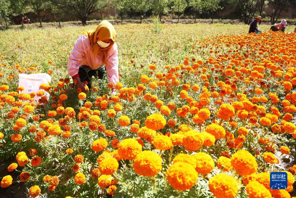 初秋時(shí)節,甘肅省定西市隴西縣4萬(wàn)畝萬(wàn)壽菊進(jìn)入采摘期,農民們趁著(zhù)晴好天氣采摘、裝車(chē)、出售,田間地頭一派忙碌景象。