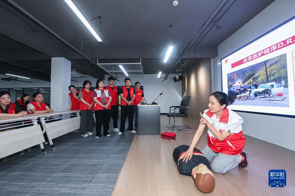 9月5日,道場(chǎng)鄉紅十字會(huì )、衛生院醫護人員在對志愿者們進(jìn)行止血包扎、心肺復蘇等應急救護實(shí)操培訓。