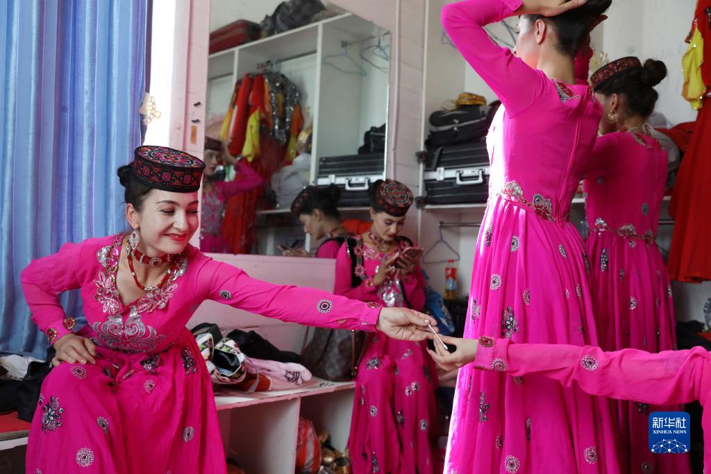 在新疆塔什庫爾干塔吉克自治縣帕米爾旅游區游客服務(wù)中心,縣文工團演員在演出前做準備(9月4日攝)。
