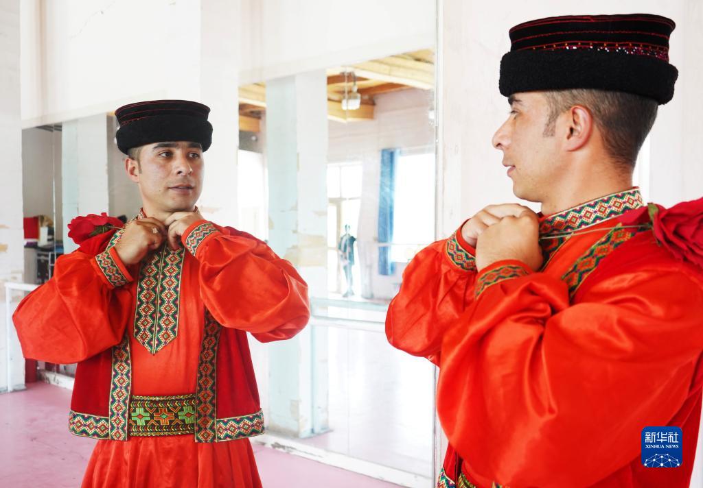 在新疆塔什庫爾干塔吉克自治縣帕米爾旅游區游客服務(wù)中心,縣文工團演員在演出前做準備(9月4日攝)。