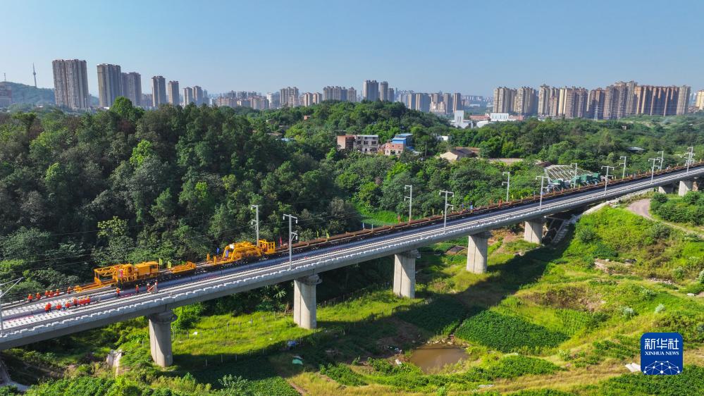 這是9月6日在四川省瀘州市馮灣特大橋拍攝的渝昆高鐵川渝段鋪軌施工現場(chǎng)(無(wú)人機照片)。