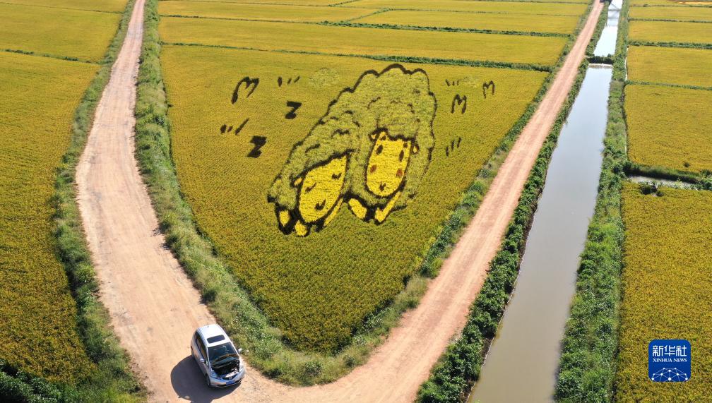 初秋時(shí)節,遼寧省鞍山市臺安縣遼河文化旅游景區的稻田畫(huà)吸引不少游客前來(lái)參觀(guān)游覽。由多種顏色組成的巨型稻田畫(huà)勾勒出豐收壯美景象。