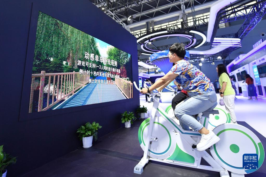 9月7日,參觀(guān)者在2023中國國際數字經(jīng)濟博覽會(huì )上體驗動(dòng)感單車(chē)。