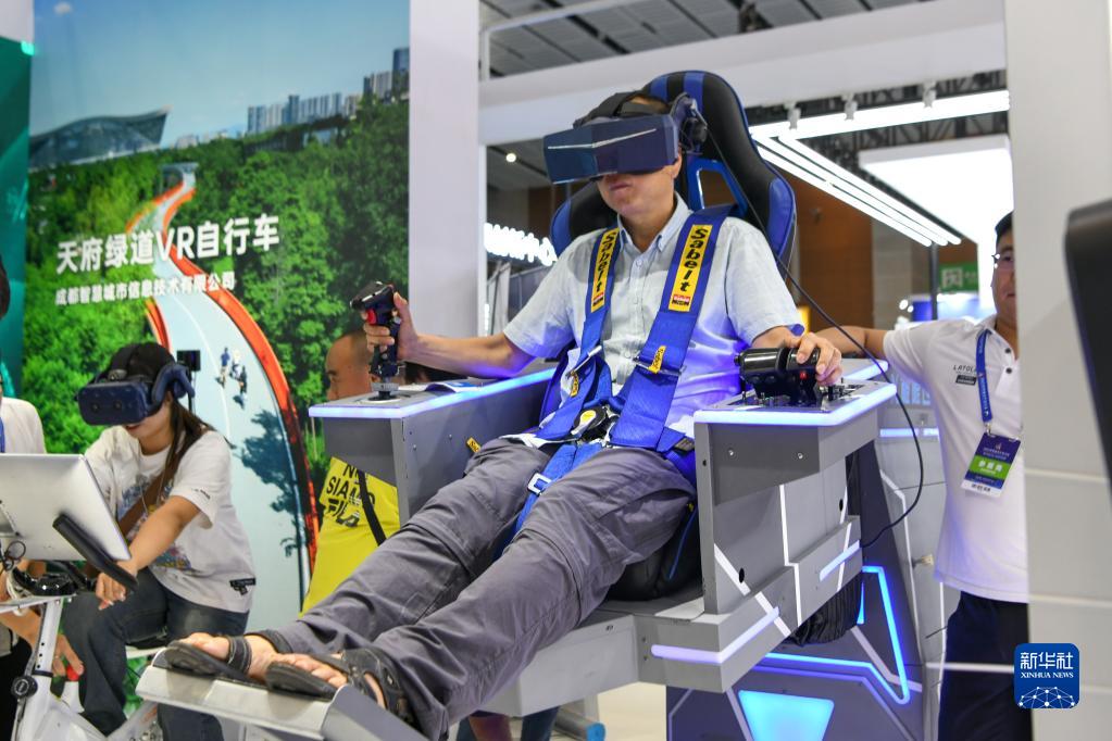 9月7日,在“2023世界顯示產(chǎn)業(yè)大會(huì )新型顯示創(chuàng )新成果展”現場(chǎng),觀(guān)眾體驗VR飛行。