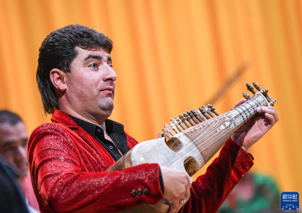 新疆塔縣文工團樂(lè )手吾拉木艾力沙·艾米茹米亞在排練節目《絲路遺夢(mèng)》時(shí)演奏高音熱瓦普(9月4日攝)。新華社記者 王菲 攝