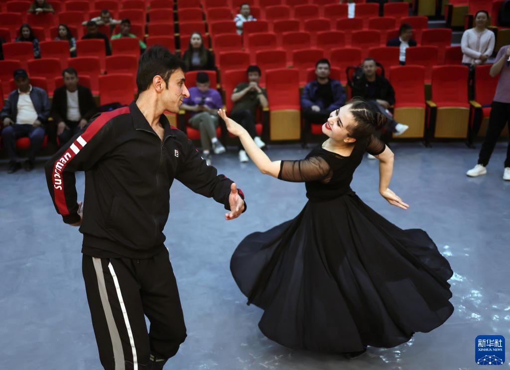 舞蹈演員巴合提拉·居馬汗(左)和馬熱吾麗·賽力塔那提在排練節目《塔吉克婚禮》(9月4日攝)。新華社記者 蘭紅光 攝