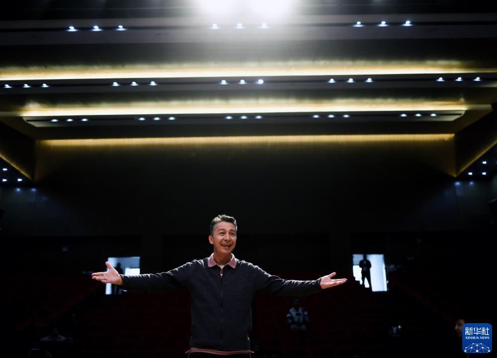新疆藝術(shù)劇院歌舞團再比江·阿地力導演在塔縣文化服務(wù)中心劇場(chǎng)指揮演員排練(9月4日攝)。新華社記者 蘭紅光 攝