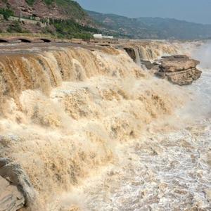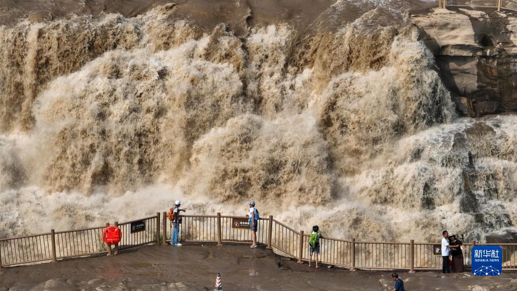 近日,受上游降雨和水庫調節放水影響,黃河壺口瀑布主副瀑布連成一線(xiàn),滾滾黃河水奔騰而下,吸引游客駐足觀(guān)看。