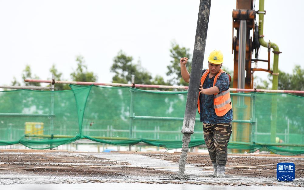 9月9日,工人在??谛潞8酆湍细邸岸€(xiàn)口岸”(貨運)集中查驗場(chǎng)所建設項目上施工作業(yè)。