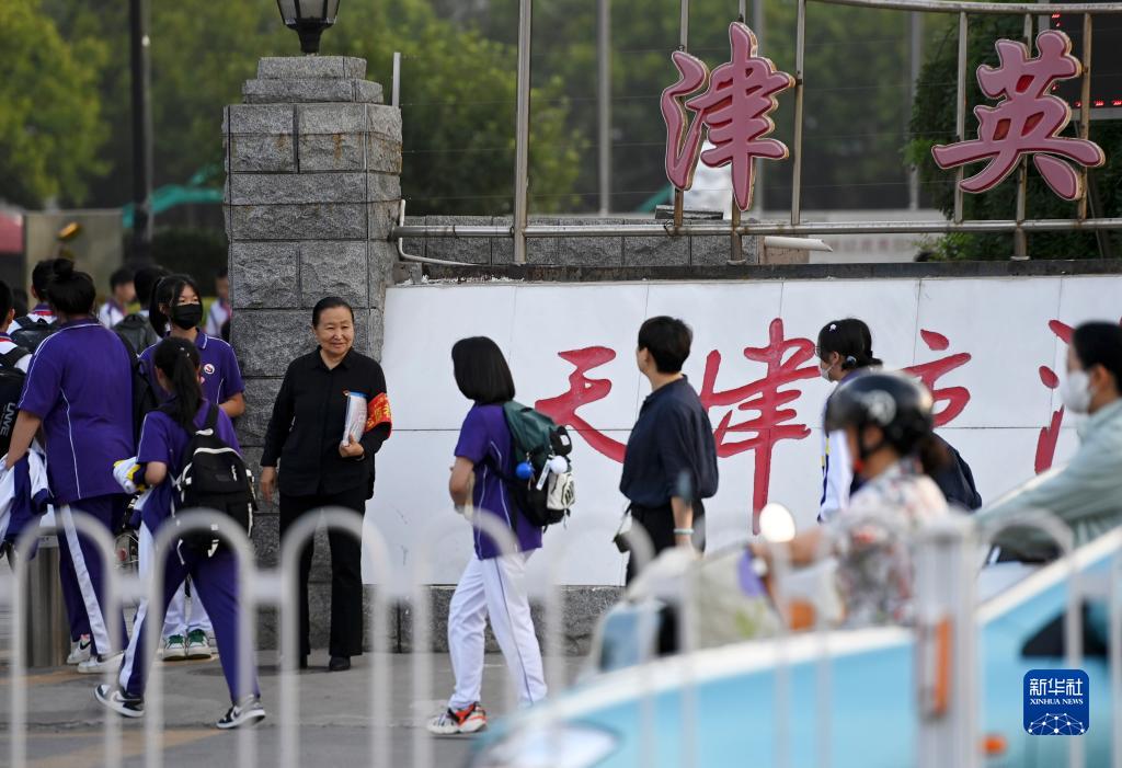 張慧穎在津英中學(xué)門(mén)口迎接學(xué)生入校(9月8日攝)。