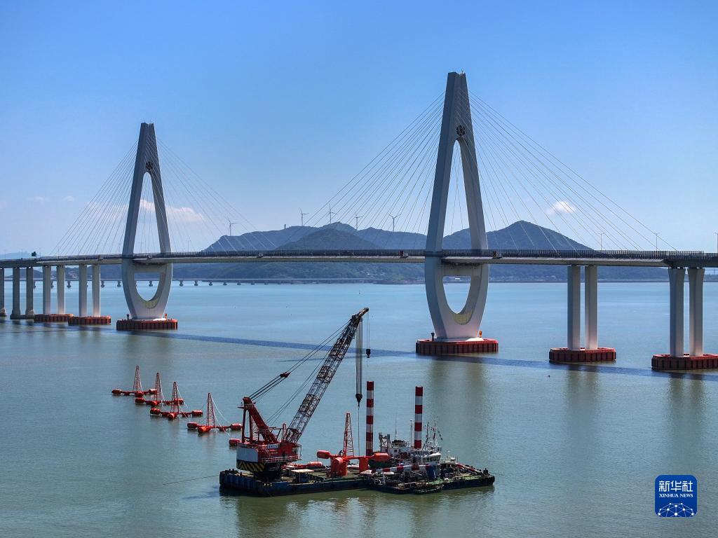 9月10日,一艘工程船在舟山市定海區馬目海邊為舟岱大橋南通航孔橋安裝防船舶撞擊系統(無(wú)人機照片)。