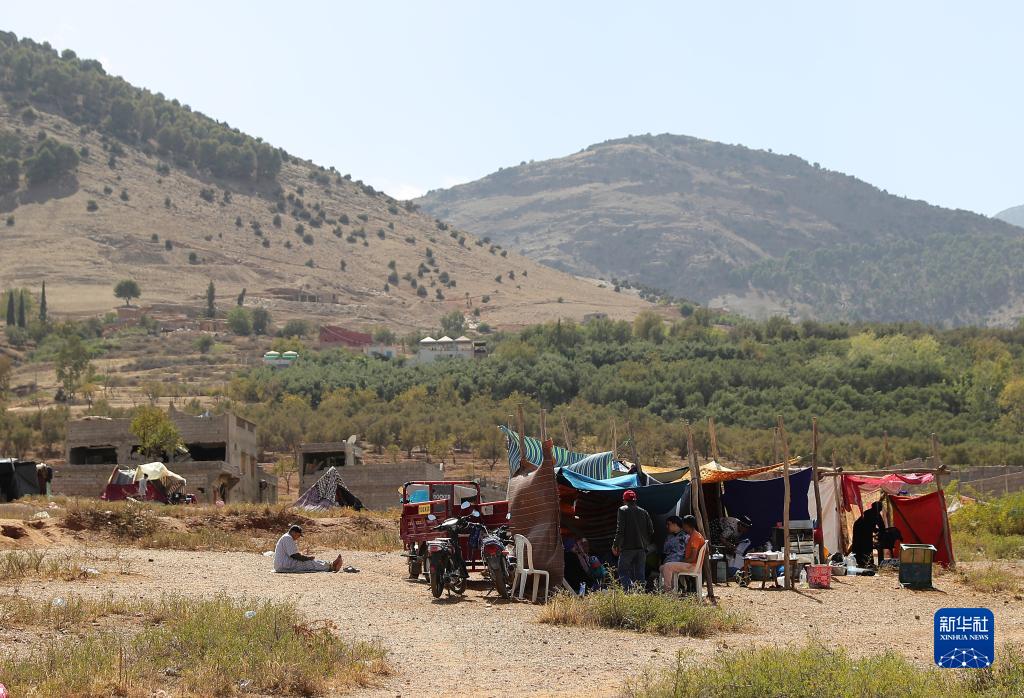 這是9月10日在摩洛哥震中附近的艾米茲米茲村拍攝的一處臨時(shí)安置點(diǎn)。