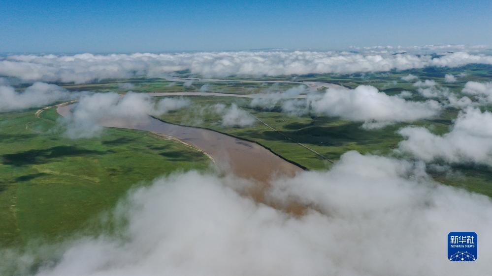 這是8月22日清晨在四川省阿壩藏族羌族自治州若爾蓋縣唐克鎮拍攝的黃河九曲第一灣景色(無(wú)人機照片)。