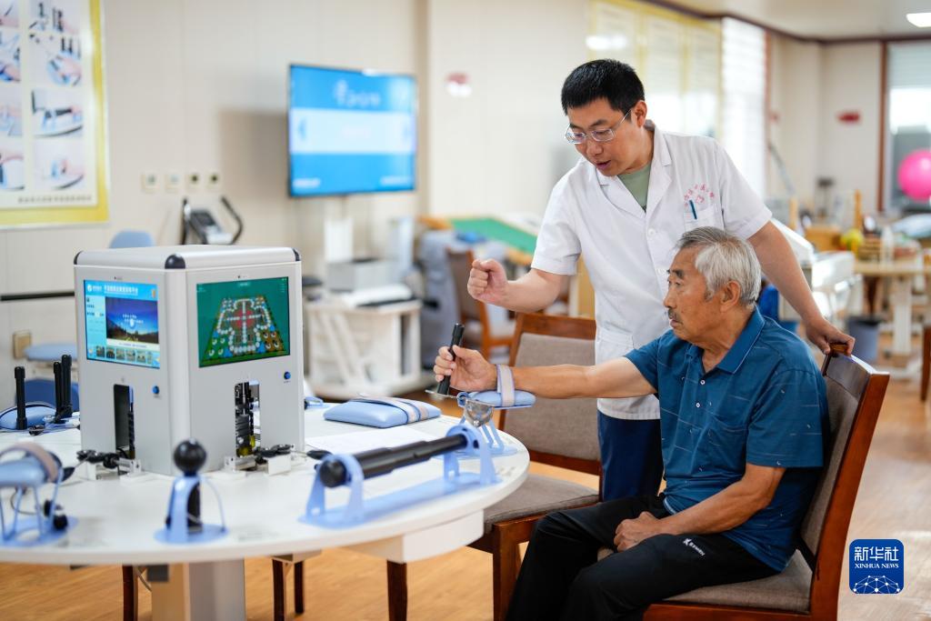 9月12日,河北省唐山市古冶區一家養老機構的工作人員在指導老人進(jìn)行腕部康復訓練。